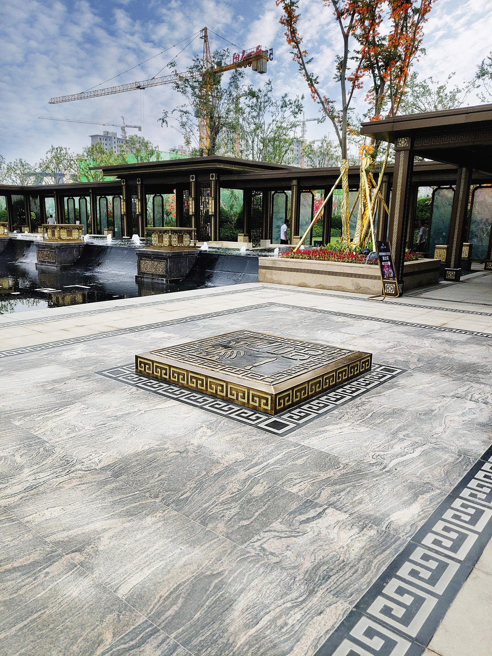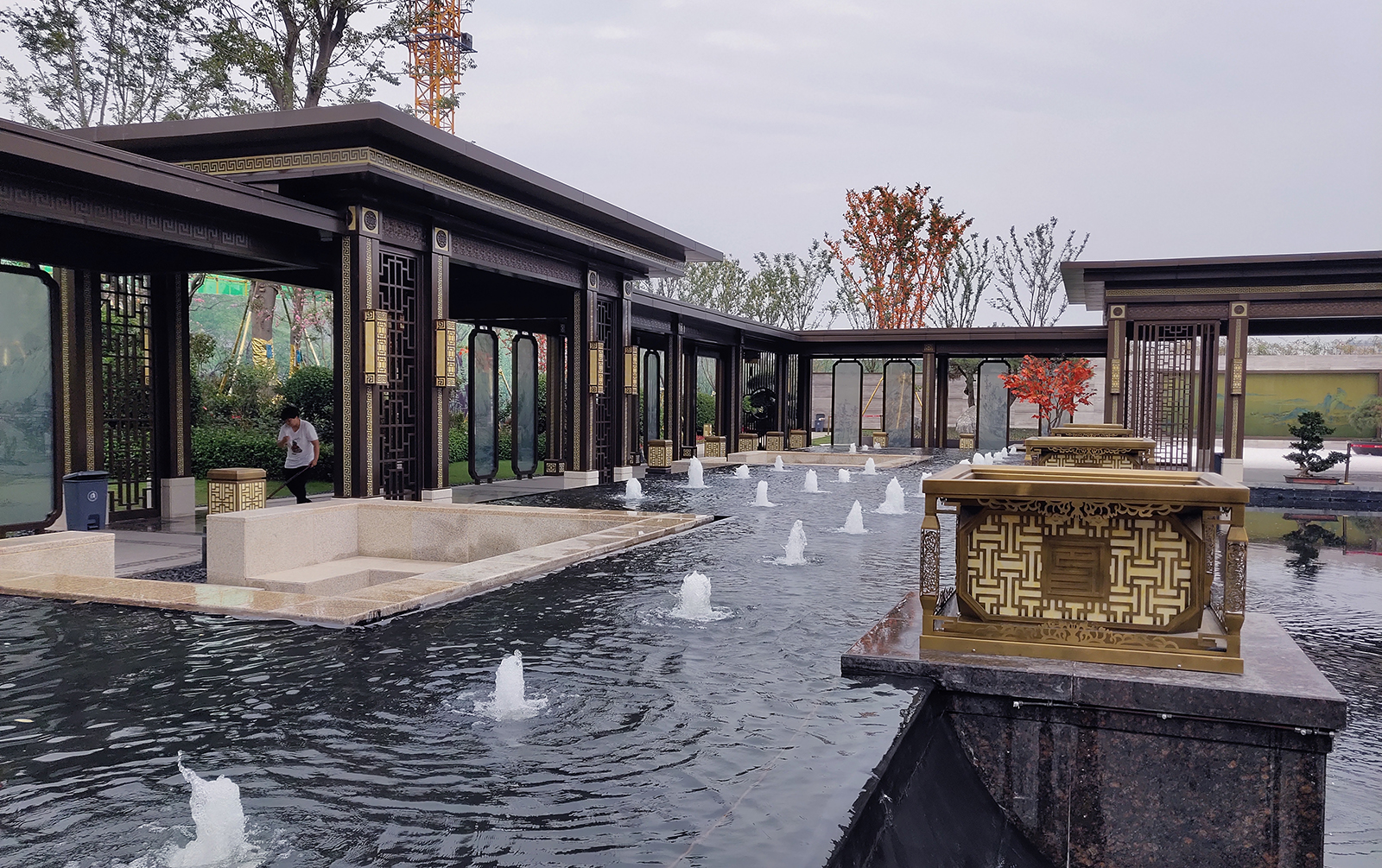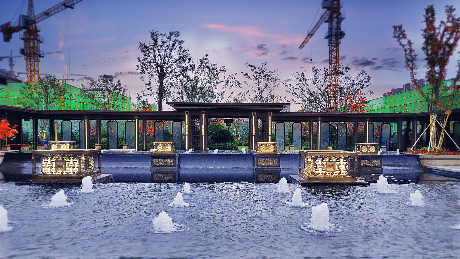 鏡面水景輕靈、優雅、致韻;雙排四座宮燈雕琢萬字符,寓意前程萬福。