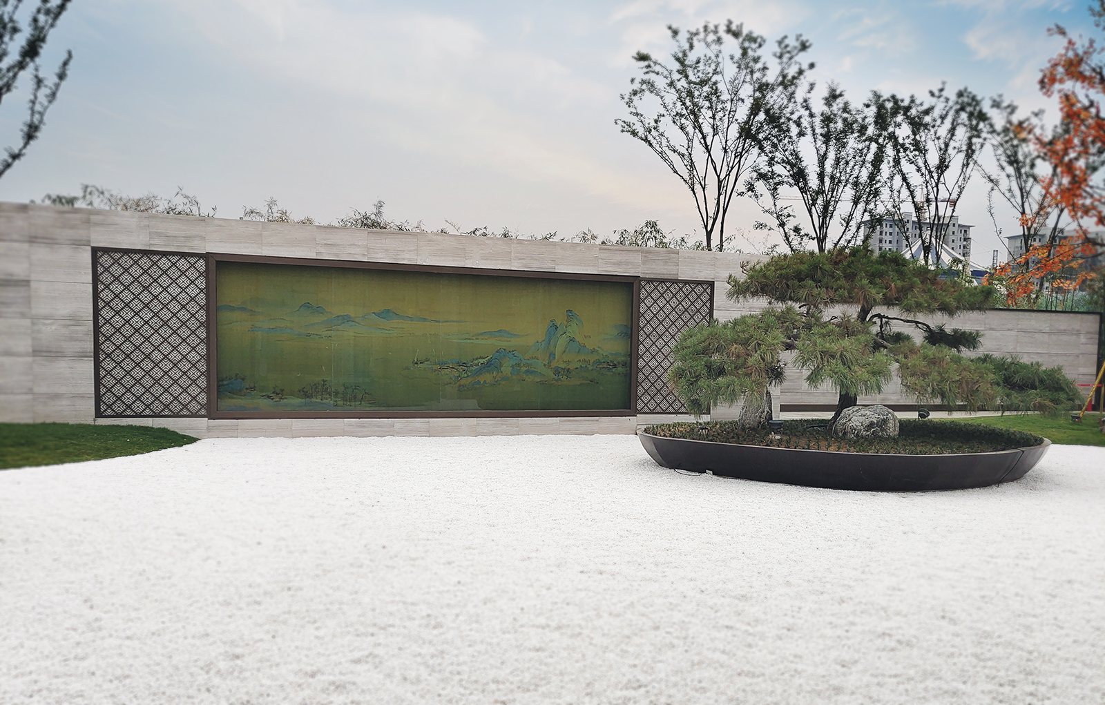 以山、水、亭、草坪的虛實變化描繪出一幅曠遠之境 。
