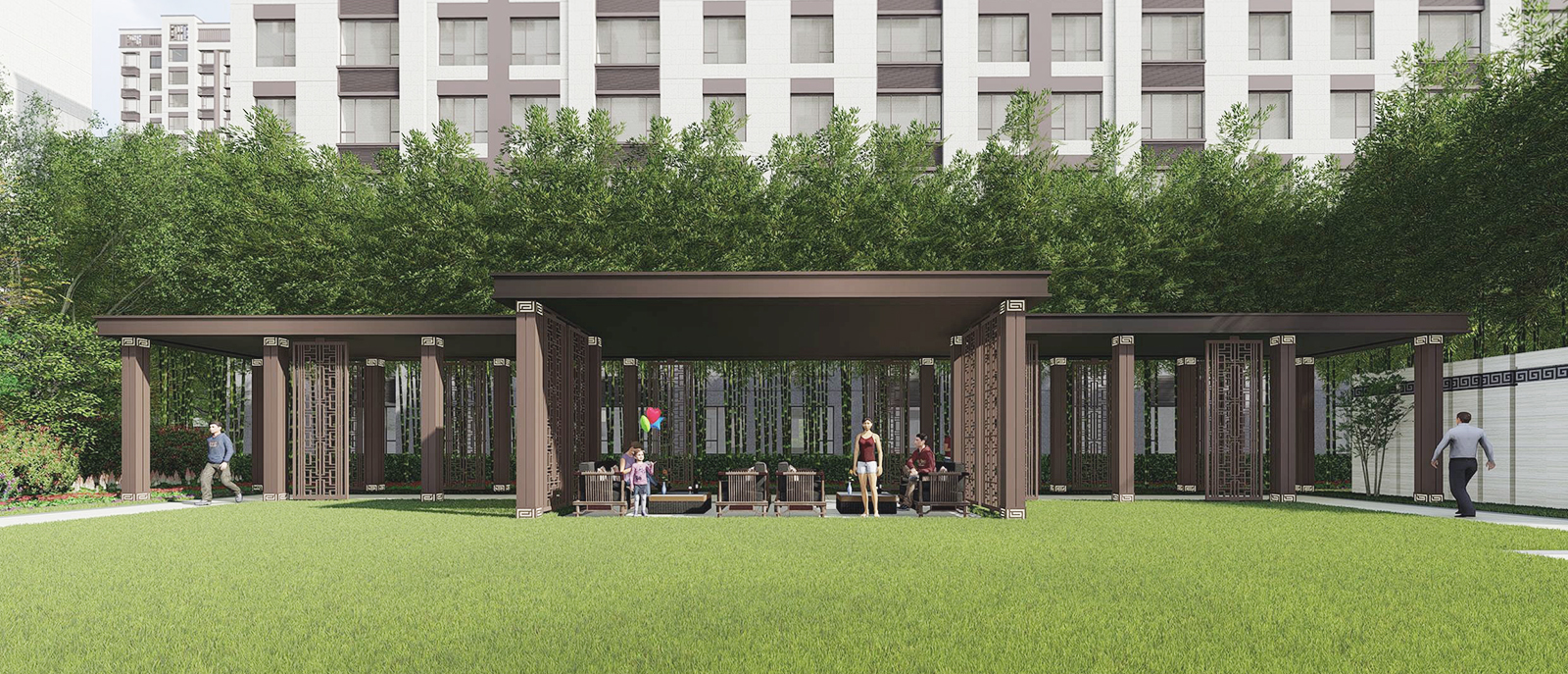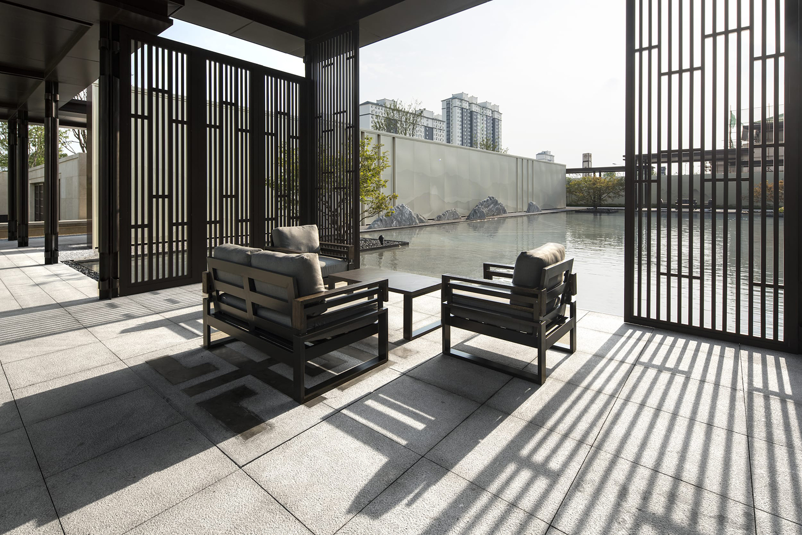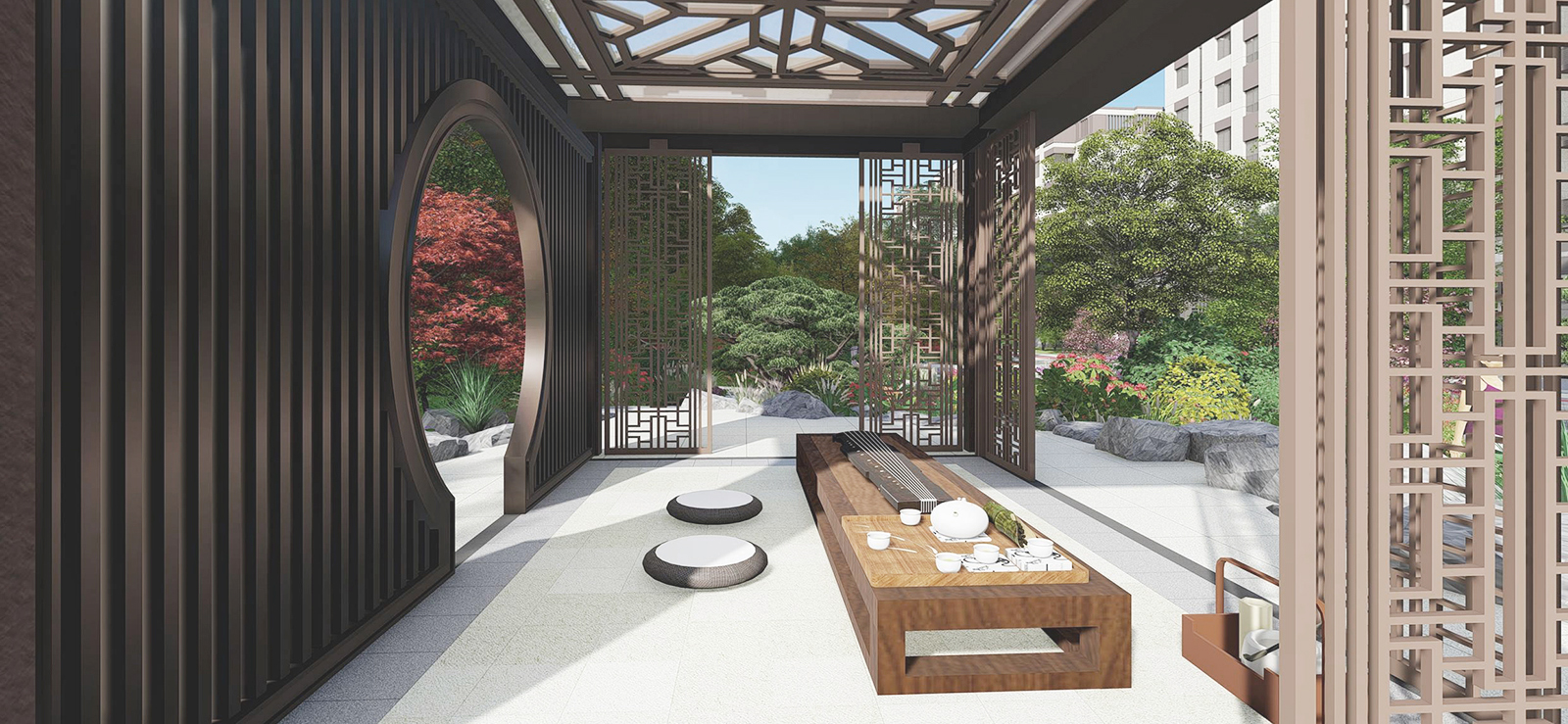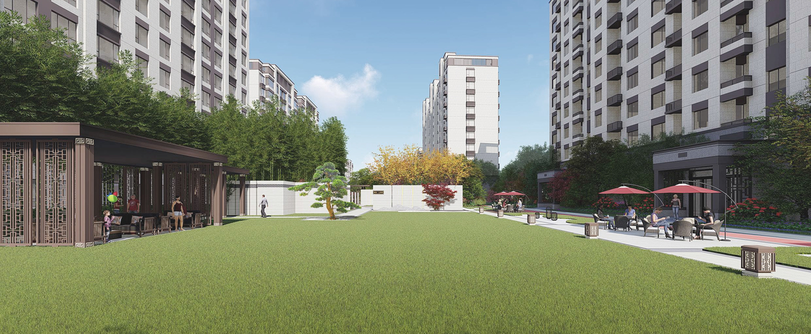 在全區(qū)最為開(kāi)闊,陽(yáng)光最為充足的地段,自然而然,大氣舒緩的陽(yáng)光大草坪,因時(shí)因地而生,在對(duì)景照壁虛實(shí)掩映之后,場(chǎng)地瞬間展開(kāi),追求極致的簡(jiǎn)雅之中給業(yè)主帶來(lái)的是最溫暖的身心感受,再之后,又在一曲一折中將人引導(dǎo)之山水園,整個(gè)二進(jìn)院作為景觀會(huì)客中庭,會(huì)客、訪友,三五知己,闊談人生,閑適愜意。