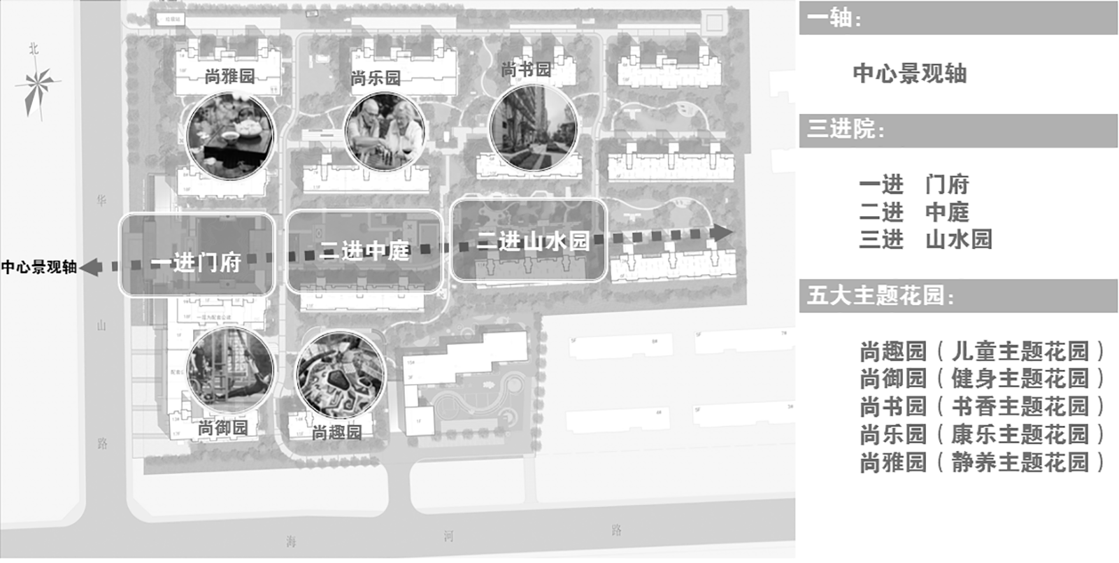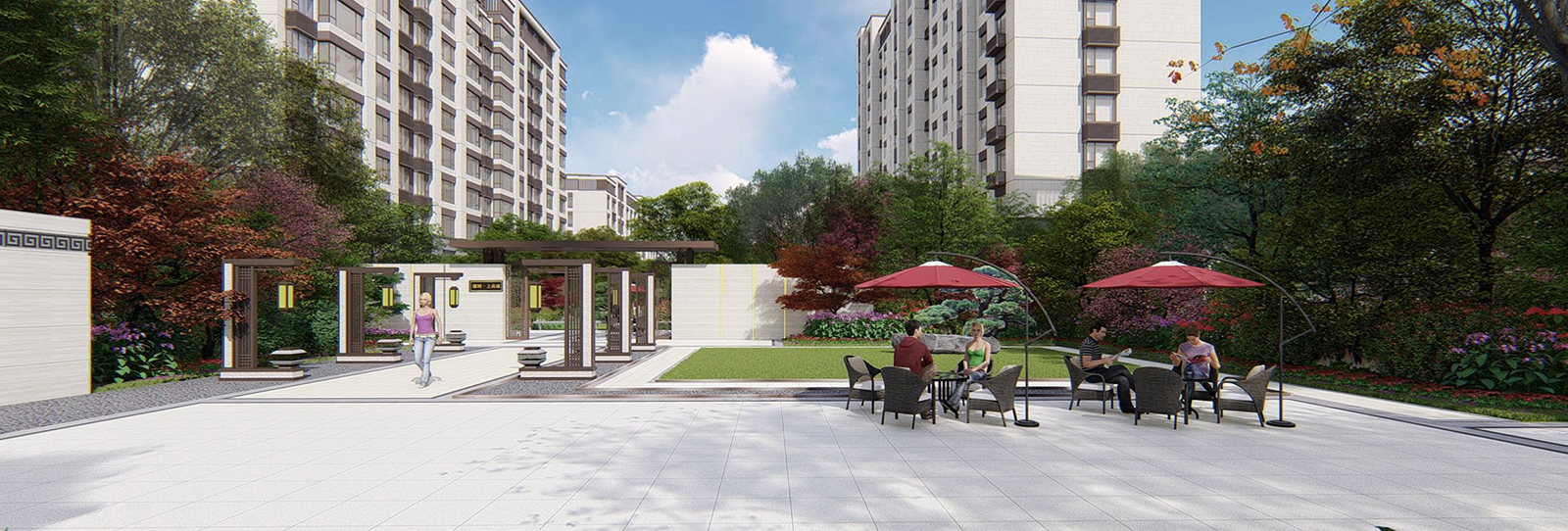 一軸、三進(jìn)院,五大主題宅間景觀,以顯勢(shì),迎客 、閑游、幸福悅居貫穿始終,采用現(xiàn)代、輕靈的中式設(shè)計(jì)手法 ,見(jiàn)徐東方意境元素 。