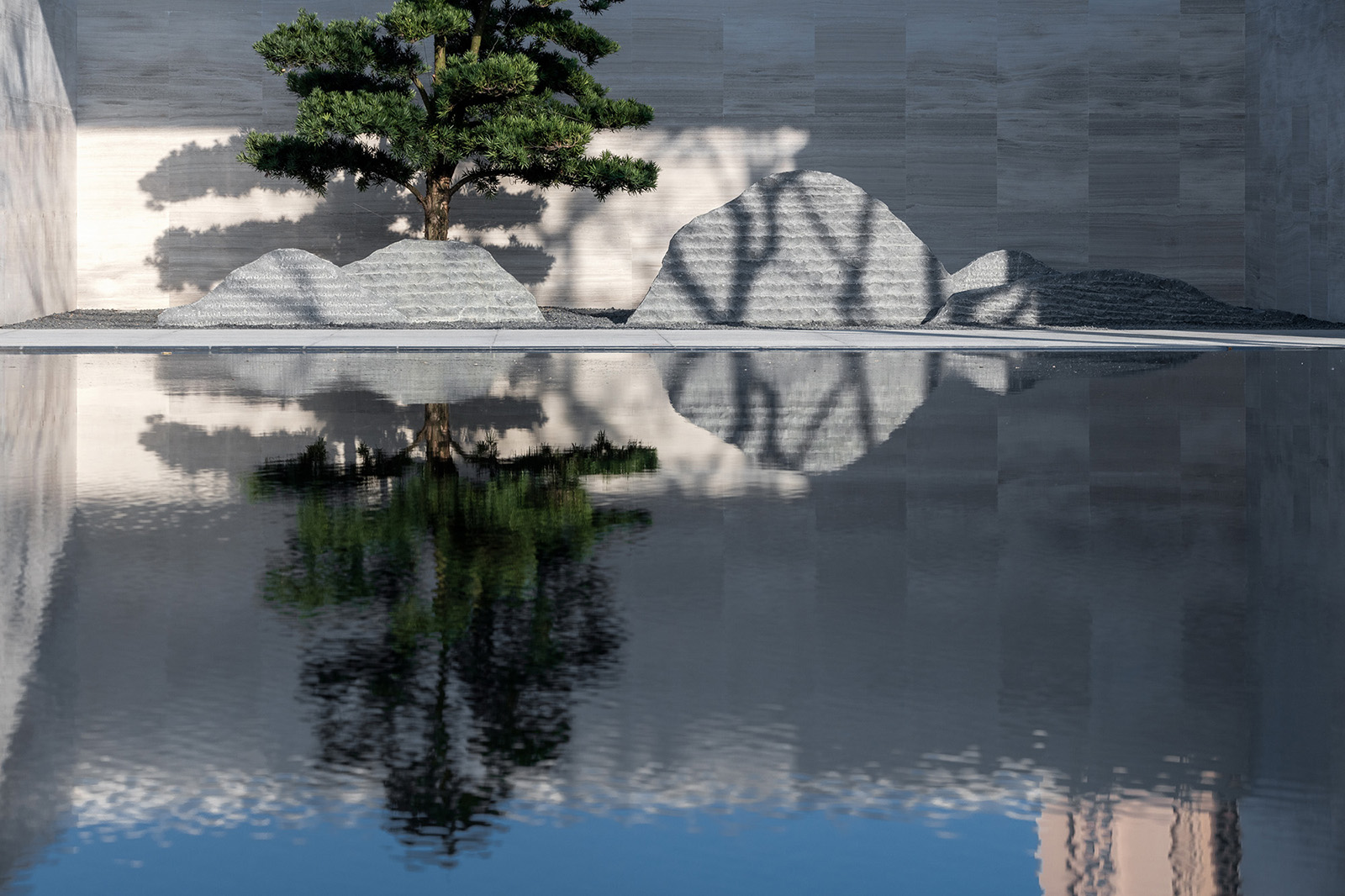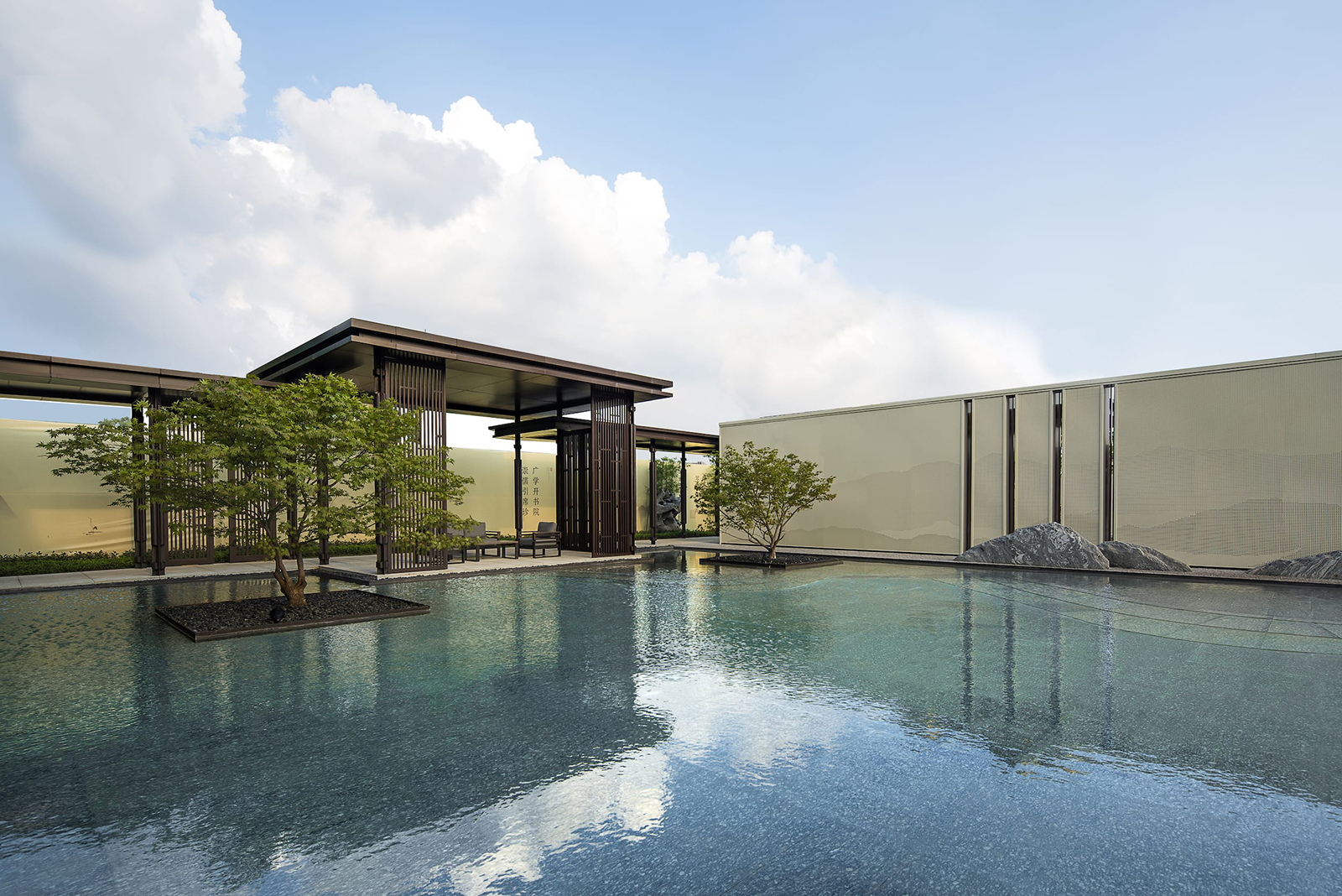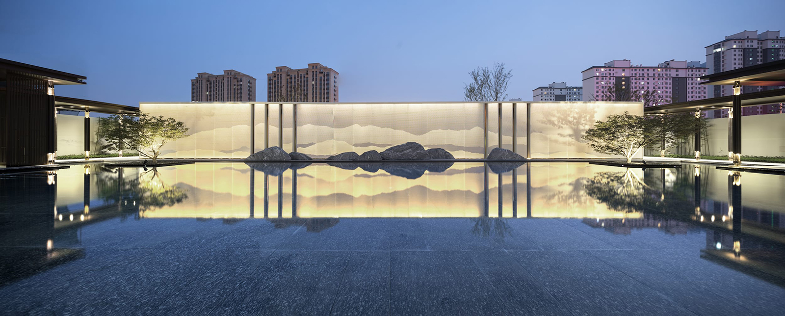 “水利萬(wàn)物而不爭(zhēng)”,入口府門與造型景石疏導(dǎo)人車動(dòng)線,以“迎·入境壺天,禮·天宇空明——境·圖云境水”為展示序列,層層遞進(jìn)。可所謂“入則壺天自春”,清凈悠然。對(duì)景景墻巍峨大氣,通過(guò)風(fēng)雨連廊,見(jiàn)中軸線大尺度水景,如銀河望月,藏風(fēng)納氣。水景曲線如群山往復(fù),流水潺潺,禮儀燈光步道,靜謐舒心,大氣、精致、從容。