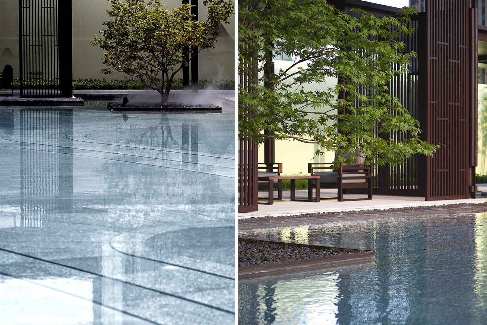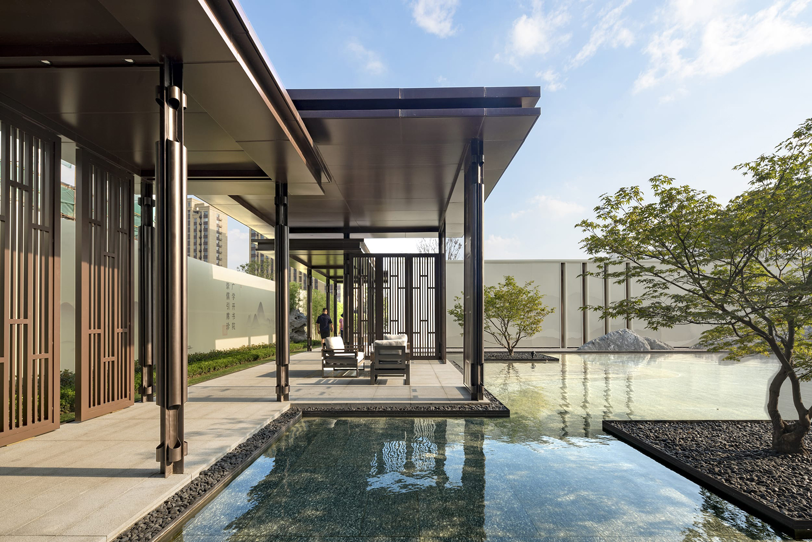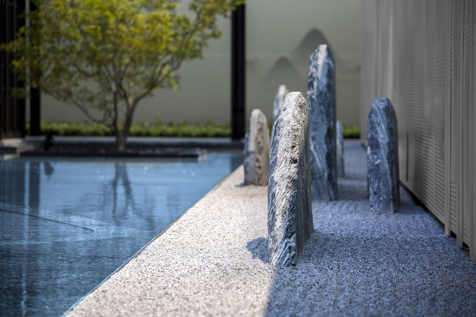 “水利萬(wàn)物而不爭(zhēng)”,入口府門與造型景石疏導(dǎo)人車動(dòng)線,以“迎·入境壺天,禮·天宇空明——境·圖云境水”為展示序列,層層遞進(jìn)。可所謂“入則壺天自春”,清凈悠然。對(duì)景景墻巍峨大氣,通過(guò)風(fēng)雨連廊,見(jiàn)中軸線大尺度水景,如銀河望月,藏風(fēng)納氣。水景曲線如群山往復(fù),流水潺潺,禮儀燈光步道,靜謐舒心,大氣、精致、從容。