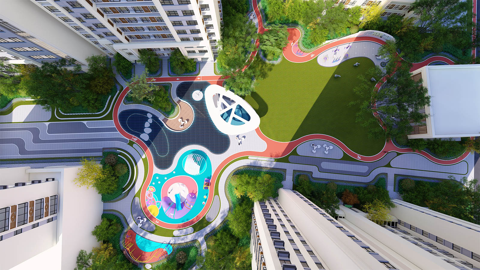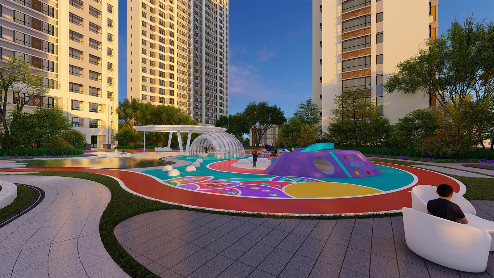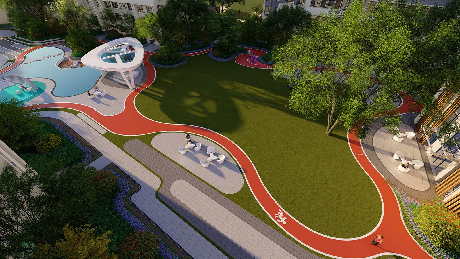 通過柔美曼妙的曲線環繞形成一片溫馨、和煦、柔軟的開敞空間,陽光兼具詩意,草坪如綠毯般輕柔展開,自然優雅,