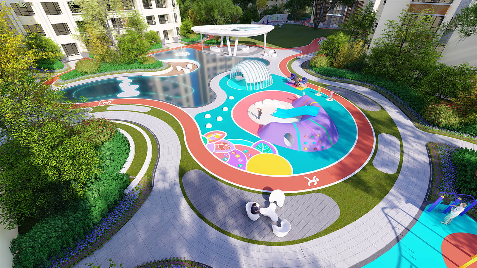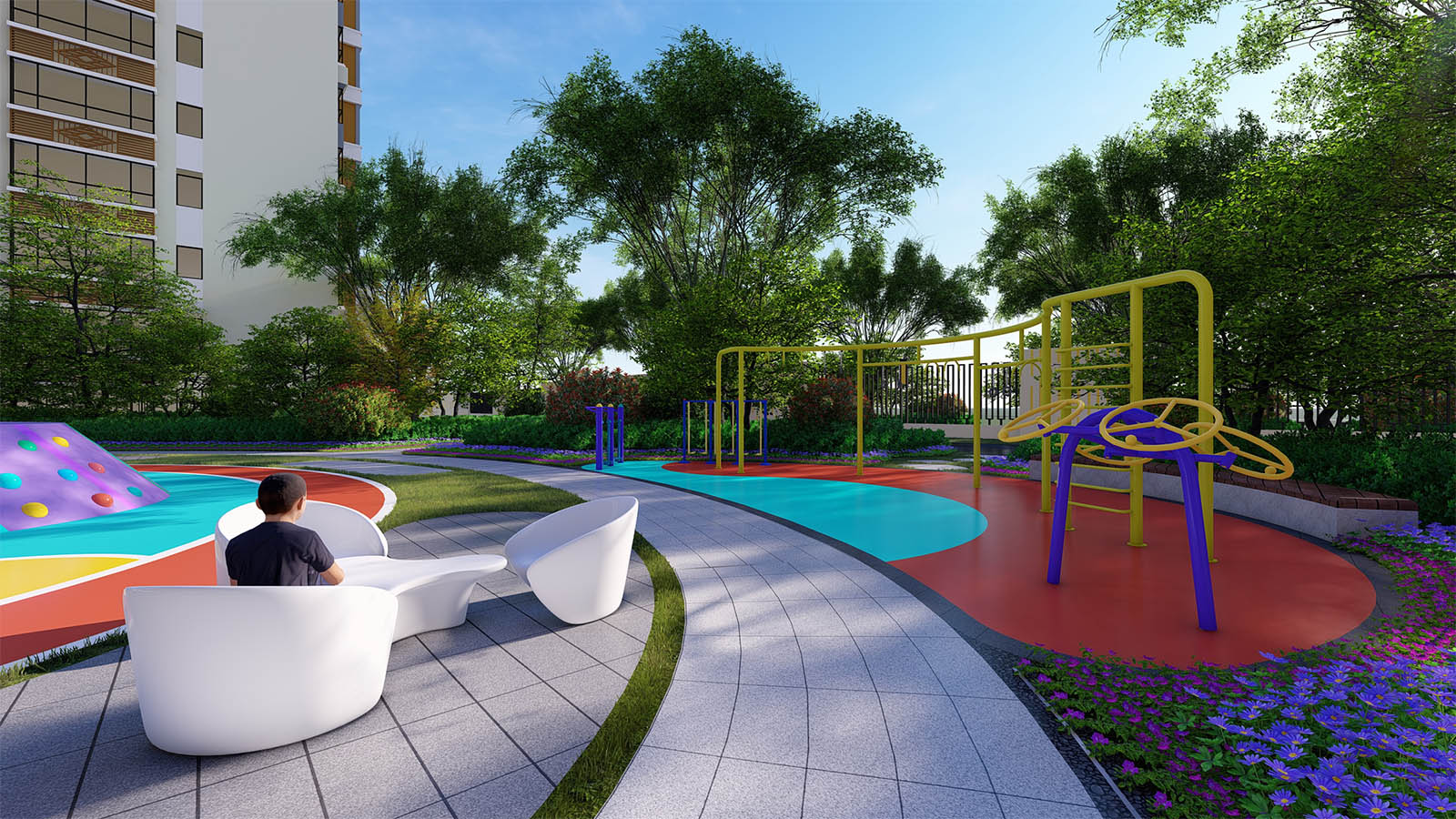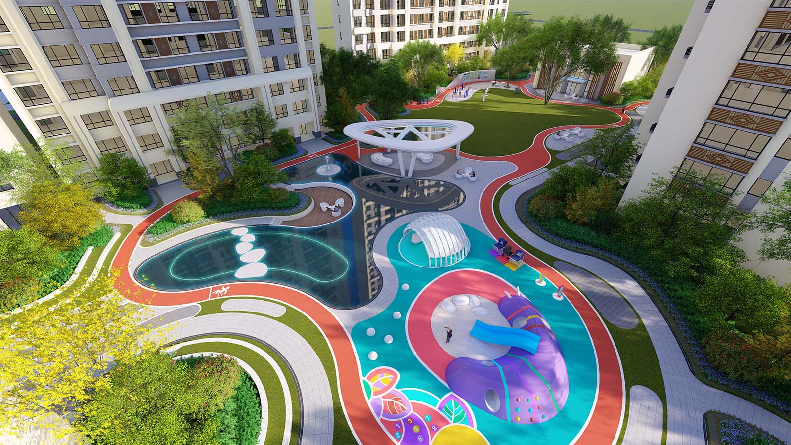 通過柔美曼妙的曲線環繞形成一片溫馨、和煦、柔軟的開敞空間,陽光兼具詩意,草坪如綠毯般輕柔展開,自然優雅,