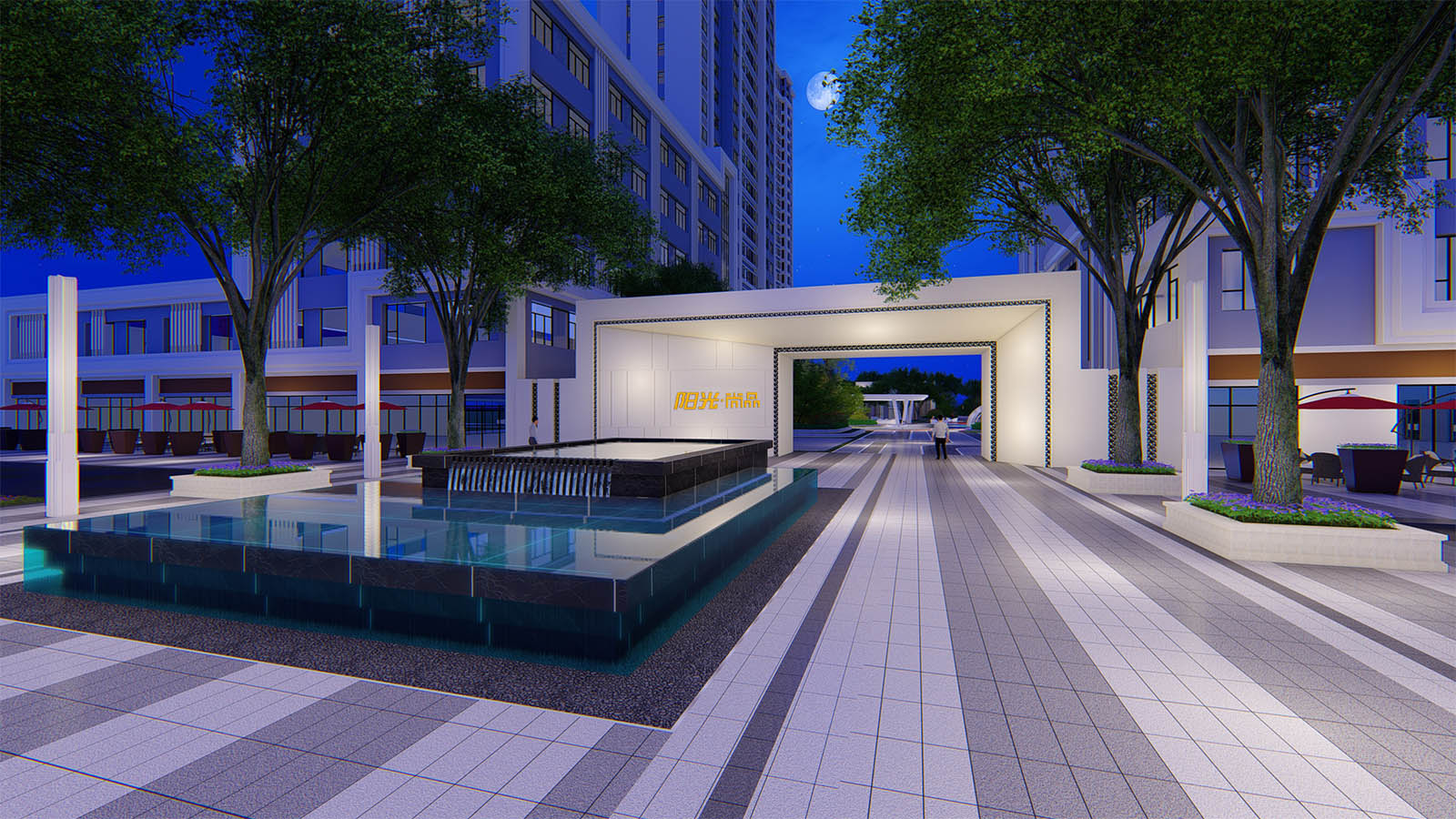 主入口重新梳理原有的商業車行交通動線,通過林蔭樹陣及景觀燈柱的布置,隔離車行動線,并引導車流由南北兩處車行入口進入,入口廣場采用簡雅的設計手法,保證人行動線安全、流暢,布置鏡面疊水水景,結合景觀樹陣與燈柱營造禮儀迎賓氛圍,引導業主悠然歸家。