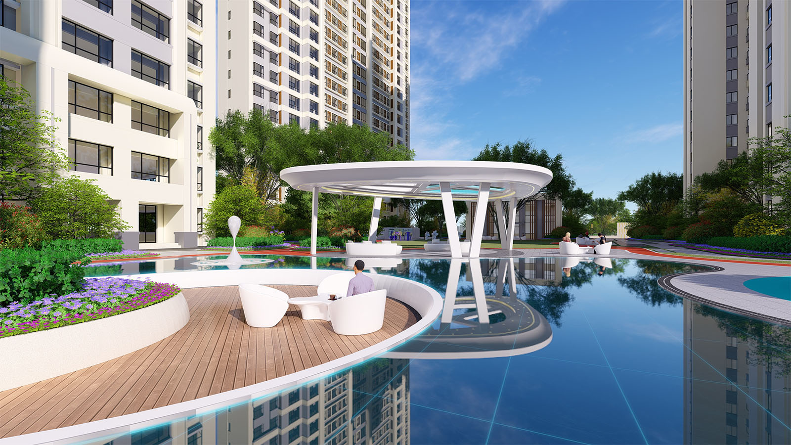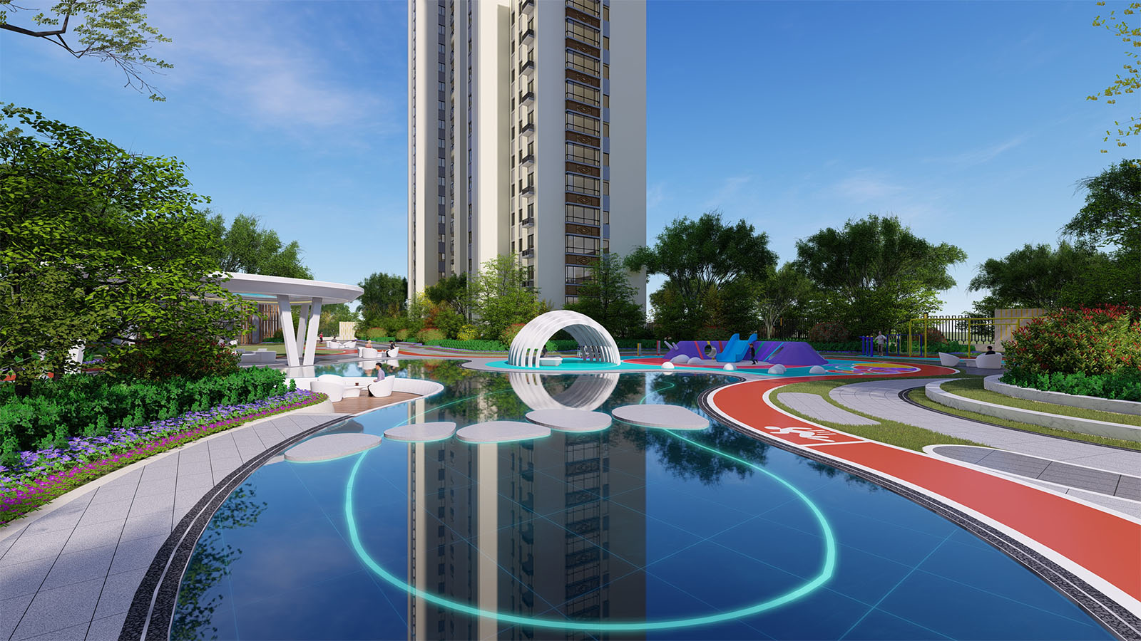 優雅靈動的線型、簡潔純凈的色彩語言,富有韻律的構圖和曲線形式,表達各生活功能區之間相互依纏的空間關系,線條柔和,以曲線構成使的場地更具延展性,采用環繞式的手法體現出溫潤與舒適的人居氛圍。