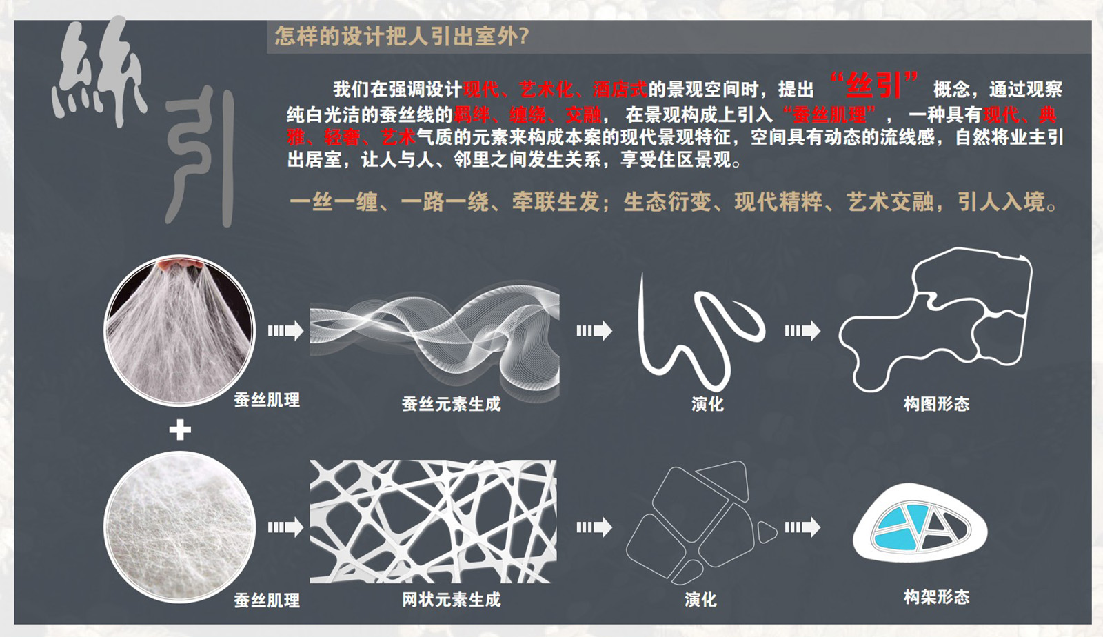 以環繞式的設計手法,梳理鏡面水系脈絡,多層絲纏繞、絞合、牽連,往復不斷,讓觀者在社區中感受心靈的溫養,