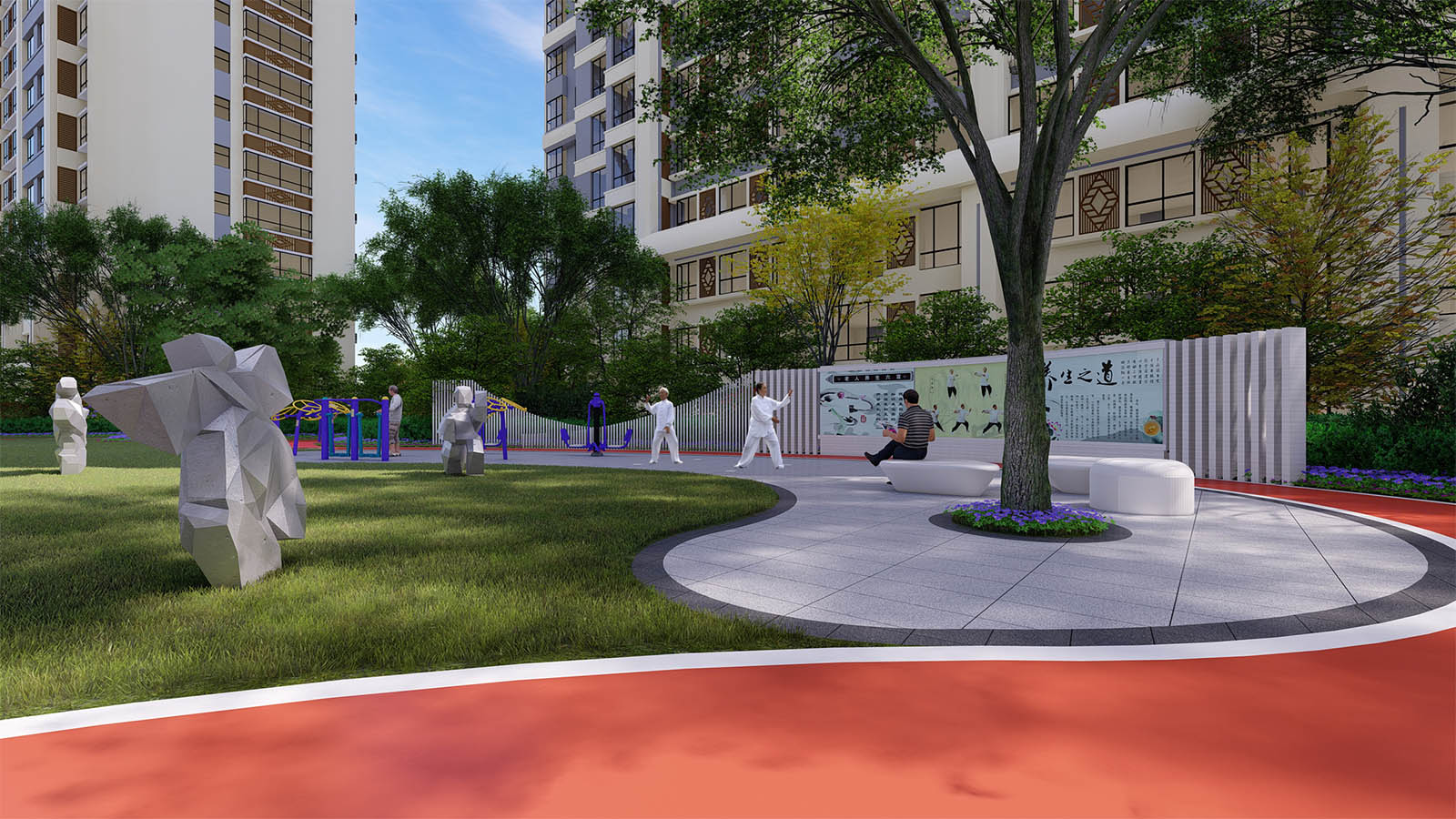 太極健身區設計太極點位,方便老人展開太極運動,特別為老人設計了棋牌娛樂空間,方便鄰里間在茶語飯后休閑時間,切磋棋牌游戲