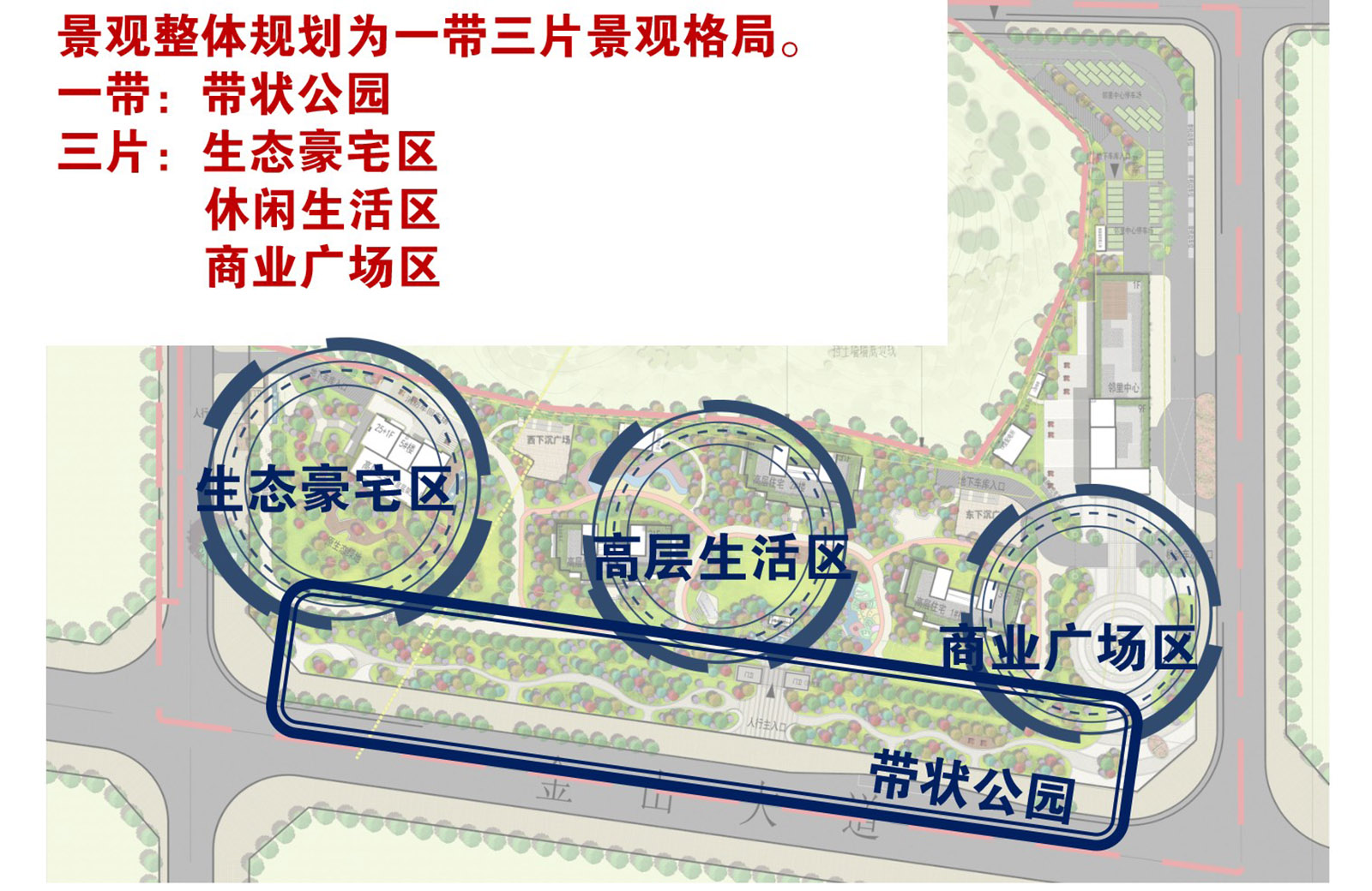 帶狀公園沿小區側,采用生態密林形式,保障小區的安靜與私密, 沿道路一側,空間更加開放,采用組團式綠化,方便居民接入。