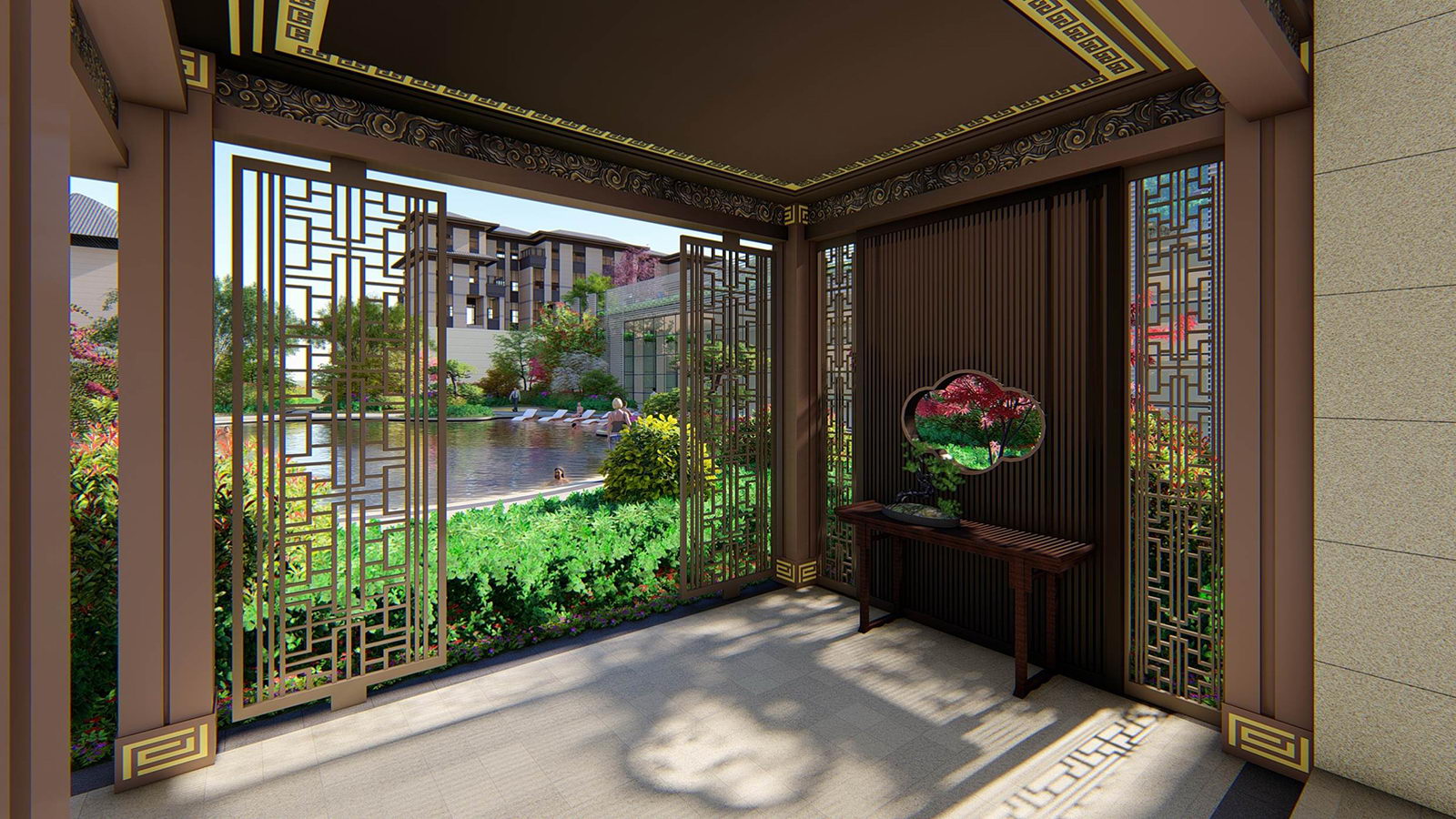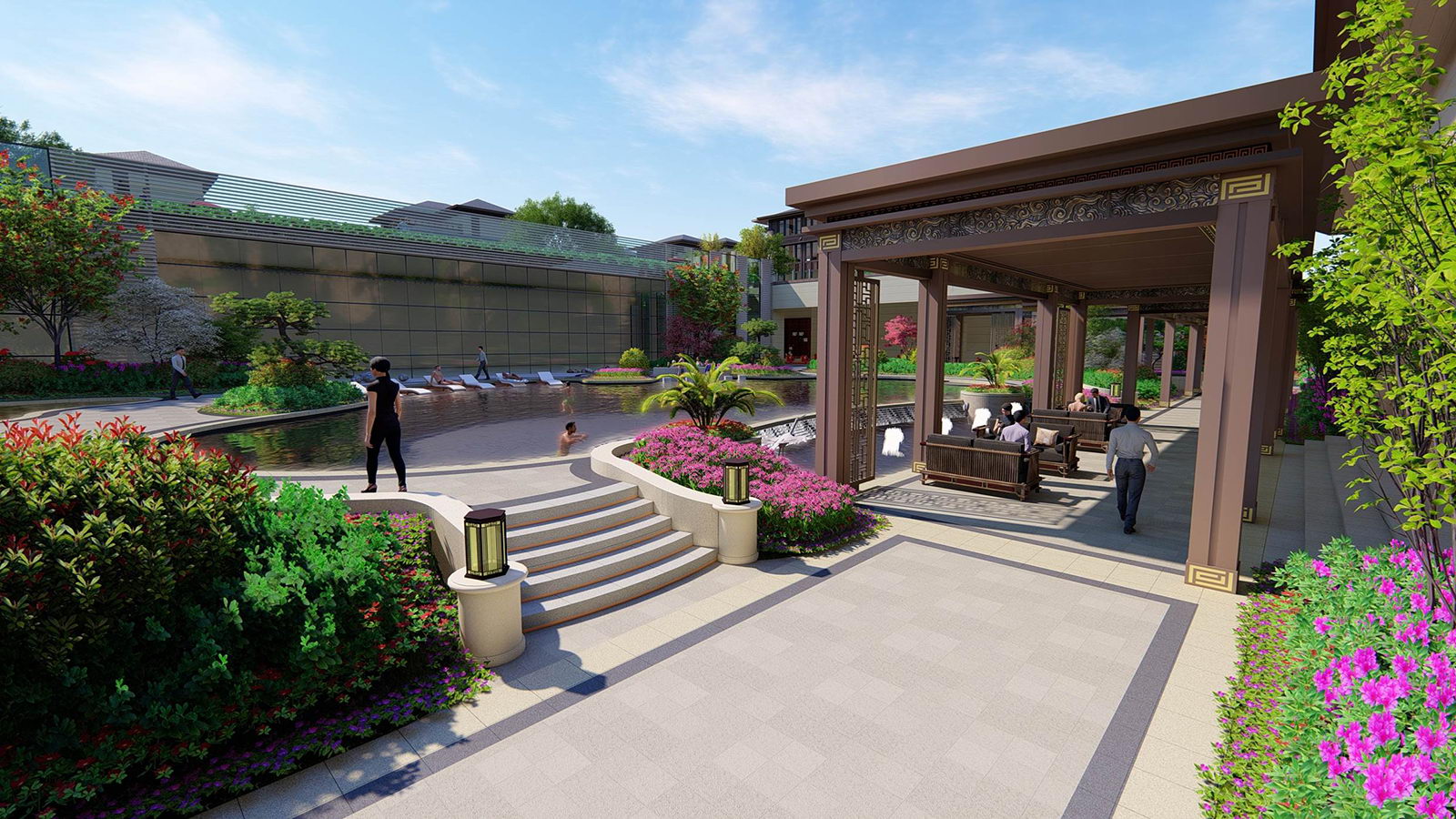 為屋頂花園營造“浮云之上,府院高堂”之意境,一層臺階,一層雍華,不畏浮云遮望眼,只緣身在最高層。屋頂之上四方美景盡收,強調空間與居者的氣度有容乃大,將屋頂有限空間放大到極致,所有豎向元素退至邊界,空間與天相呼應,因此陽光草坪設計為矩形,寓意天圓則地方,更加現代、雅致,將空間中心凸顯出來,營造極雅的空間意境。